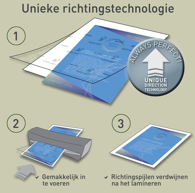 Dankzij het ontwerp met UDT (Unique Direction Technology) zorgen pijlen op elke hoes ervoor dat ze correct worden ingevoerd voor een soepele, storingsvrije lamineerervaring.