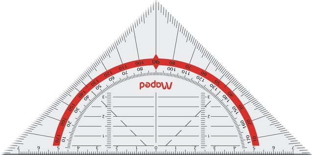 Deze bestseller heeft 4 functies in één: een gekalibreerde driehoek, het tekenen van symmetrische lijnen, van parallelle lijnen en het is een gradenboog.