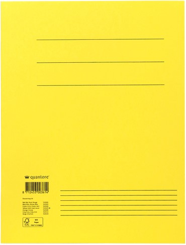 Door (leverproblemen) leveren we momenteel een alternatief zonder opdruk uit. Afbeelding wijkt af van de werkelijkheidKies voor duurzaamheid en kwaliteit met de dossiermap Quantore A4 250gr geel. Deze stevige map is vervaardigd uit 250 grams gerecycled manillakarton en biedt optimale bescherming voor je documenten. Dankzij de drie stofkleppen blijven losse papieren netjes op hun plaats, ideaal voor gebruik in archieven, kantoren of thuis. De map voldoet aan de Blauwe Engel- en FSC-certificeringseisen, wat garant staat voor milieuvriendelijk materiaalgebruik. Met het A4-formaat is de map perfect afgestemd op standaarddocumenten. Verpakt per 5x10 stuks in een omdoos – klaar voor intensief gebruik.Kenmerken: