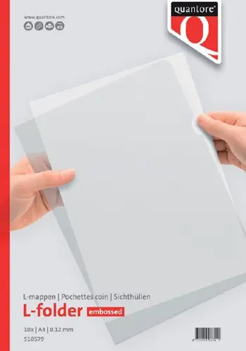 De Quantore L-model insteekmap met nerfstructuur is ideaal voor het netjes opbergen en beschermen van je A4-documenten. Gemaakt van stevig polypropyleen (PP) met een dikte van 0,12mm en transparante afwerking, blijft de inhoud goed zichtbaar terwijl deze beschermd is tegen vuil en kreukels. De boven- en rechterzijde zijn open, waardoor je documenten gemakkelijk kunt in- en uitnemen. Dankzij de copysafe-eigenschap blijven afdrukken helder zonder te verkleuren. Verpakt per 10 stuks – perfect voor dagelijks gebruik op kantoor, school of thuis.Kenmerken: