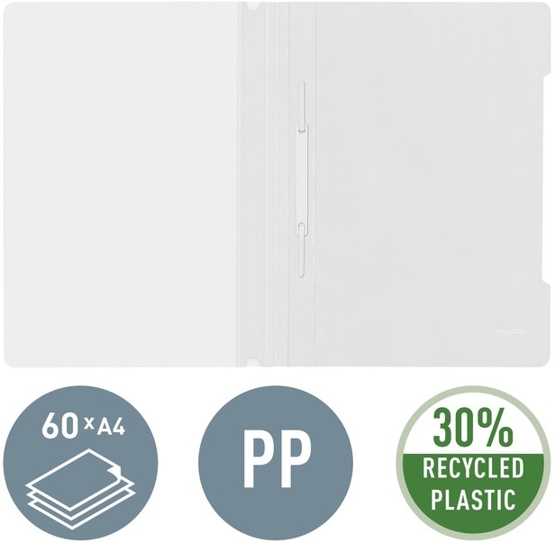 Leitz standaard plastic witte offertemap, 30% pre-consumer gerecycled plastic. Mappen van topkwaliteit, gemaakt van 30% pre-consumer gerecycled plastic voor een betere bescherming van de inhoud.