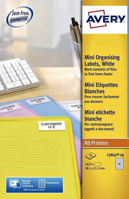 Etiket Avery L7651Y-25 38.1x21.2mm geel 1625st 25 Vel
