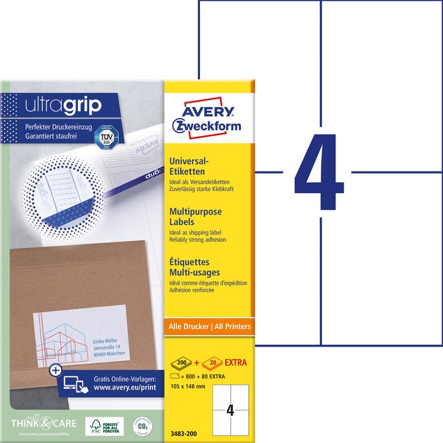 Etiket Avery LR3483 105x148mm A6 wit 400stuks 100 Vel