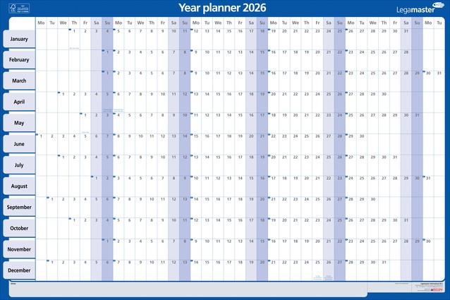Engelstalige jaarplanner van 60x90cm. Het gebruik van een jaarplanner is een praktische en visueel aantrekkelijke manier om je planning, evenementen en taken voor het jaar te organiseren. Hang op een zichtbare plek: Zoek een prominente plek in je huis of kantoor. De laminering beschermt het karton tegen slijtage en maakt de planner duurzamer en zorgt voor een langere levensduur. Op het gladde, beschrijfbare oppervlak van het gelamineerde karton kun je eenvoudig schrijven en wissen bij gebruik van droog uitwisbare markers. Markeringen kunnen eenvoudig worden gewist met een vochtige doek of een gum. Jaarplanner met de dagen aan de bovenkant (alleen de eerste twee letters) en de maanden langs de zijkant. Weekends zijn in een andere kleur gemarkeerd. Extra ruimte voor aantekeningen aan de rechterkant van de planner. Weeknummers zijn in het design opgenomen. Afmeting raster ongeveer: H42 x W22 mm. Algemene feestdagen zijn voorbedrukt. Accessoireset inbegrepen: 1 TZ111, boardmarker, 3 vellen met stickersymbolen (rood, blauw, groen), 1 set Tesa Poster Powerstrips voor eenvoudige wandmontage (4 ST). Eenvoudige wandmontage met Tesa Poster Powerstrips. Deze jaarplanner is gemaakt van materiaal uit goed beheerde, FSC®-gecertificeerde bossen en andere gecontroleerde bronnen (FSC C158462). Dit product wordt geleverd in een