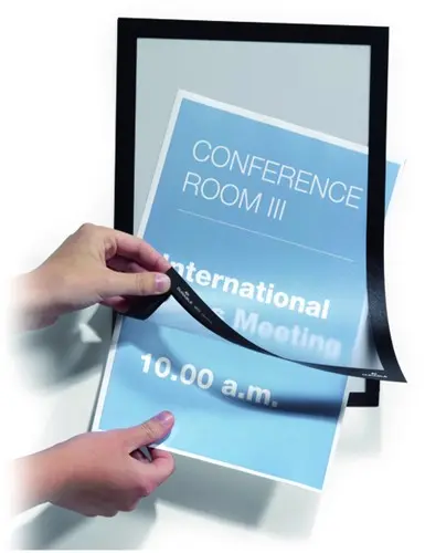 Duraframe is een zelfklevend kader, bestaande uit twee transparante folies die samen worden gehouden door de magnetische rand.