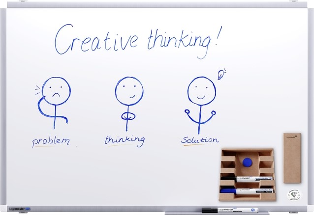 Ready to Play, meteen aan de slag met de meegeleverde zwarte en blauwe Legamaster whiteboard marker TZ1, kartonnen bordwisser, kartonnen markerhouder en magneet.