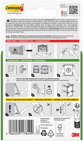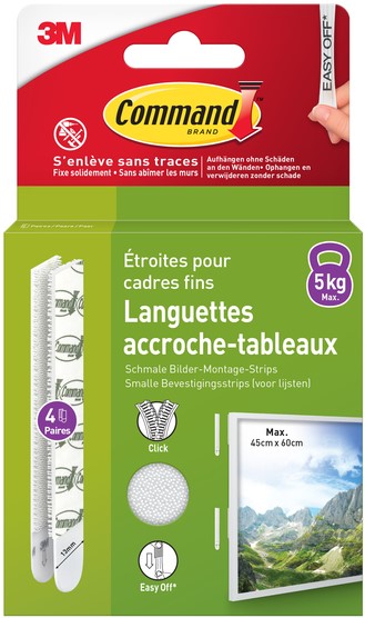 Command™ Smalle bevestigingsstrips zijn onze innovatieve oplossing voor het veilig en zonder beschadigingen ophangen van afbeeldingen in smalle lijsten. Ze hechten sterk en laten na verwijdering geen sporen achter dankzij de 3M rekontgrendelingstechnologie.