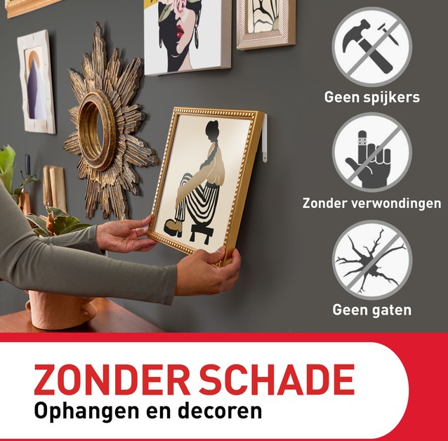 Houd lijsten vlak en veilig aan de wand; de onopvallende strips blijven verborgen achter de lijst.