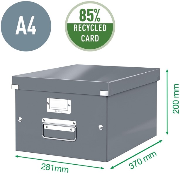 Universele opberg- en transportbox voor A4-documenten. Gemaakt van sterk, premium gerecycled karton met een gelamineerd oppervlak en metalen hoekelementen voor stevige bescherming. Stevige metalen handvaten zorgen voor een makkelijk transport en een labelhouder voor indexering. Eenvoudig in te klappen voor ruimtebesparing wanneer je hem niet nodig hebt. Dit eigentijdse ontwerp past goed in elke werkomgeving.