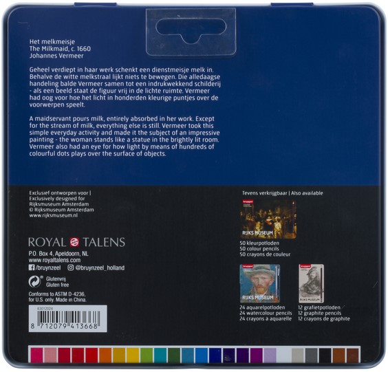 Het Melkmeisje van Johannes Vermeer, een hoogtepunt van een bezoek aan het Rijksmuseum, siert de buitenkant van dit blik met mooie kleurpotloden.