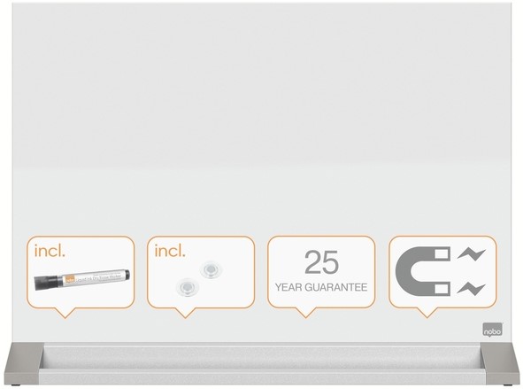 Geleverd met Nobo whiteboardstift en extra sterke glasbordmagneten