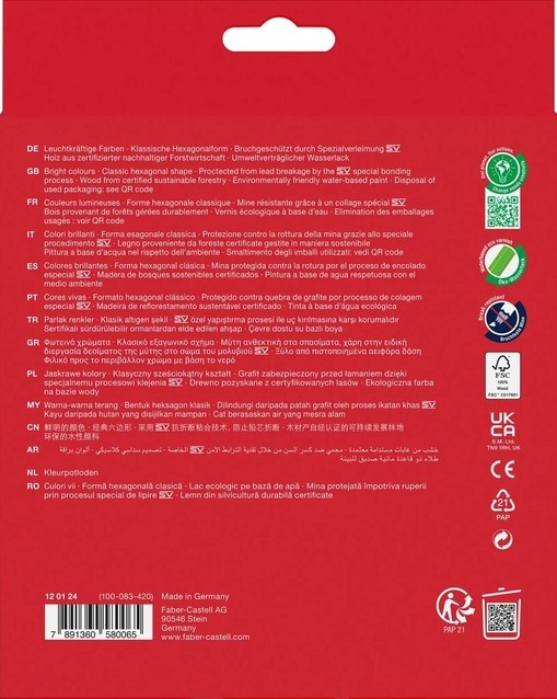Of je nu tekent, kleurt of schetst: met deze kleurpotloden werk je nauwkeurig en comfortabel en biedt alles wat je nodig hebt om je ideeën tot leven te brengen.Perfect voor zowel kinderen als volwassenen, thuis, op school of op kantoor. Het is ook zeer geschikt voor scholen en kinderopvang dankzij de stevige kwaliteit en veilige materialen. De potloden zijn voorzien van een stevige, breukbestendige kern dankzij een speciale verlijming, waardoor ze langer meegaan en prettig blijven kleuren. De zeshoekige vorm zorgt voor een comfortabele grip en voorkomt dat de potloden van tafel rollen.