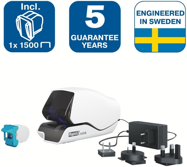 Moeiteloze, gepatenteerde casette niettechnologie voor nieten met hoge frequentie, zoals bij hotelrecepties en kassa´s. LED begeleidingssyteem toont precies waar het nietje komt.