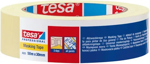 tesa® 4323 is een standaard maskeringstape voor eenvoudige schilderklussen binnenshuis. Deze licht gecrêpte, veelzijdige maskeringstape bevat een natuurrubberen kleefstof en is perfect voor minder veeleisende schilderklussen (bijv. voor wat betreft de temperatuurbestendigheid). Deze soepele papieren maskeringstape zorgt voor precieze randen tijdens het schilderen, is eenvoudig in gebruik en kan gemakkelijk binnen drie dagen worden verwijderd.