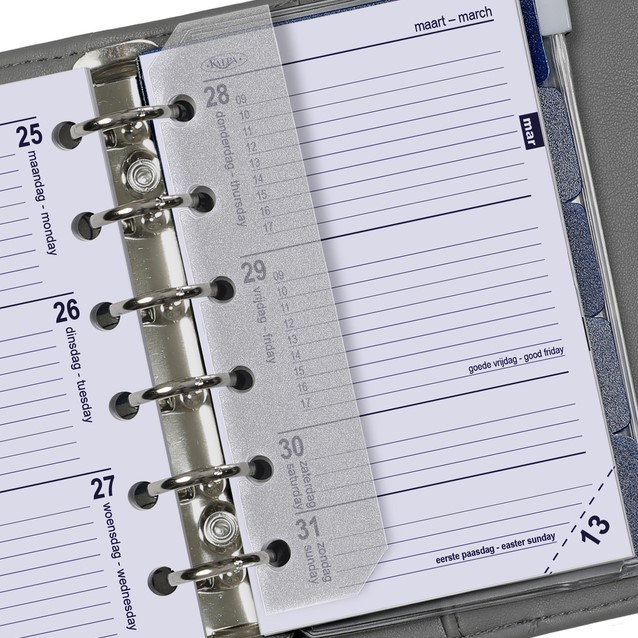 U krijgt extra 5 tabbladen, een adresset, paginascheider, een ritshoesje en een bewaardoos die u ook kunt gebruiken om uw agendavulling van vorig jaar te bewaren.