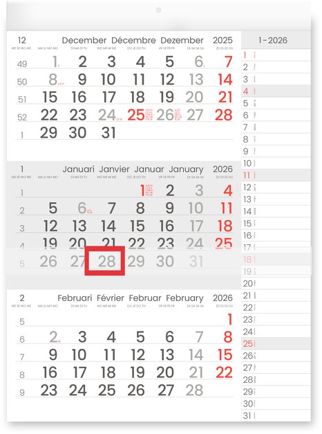 Nieuwe 3-maandkalender op ‘compact’ formaat, afmeting 300x400mm, met dagelijkse notitieruimte.