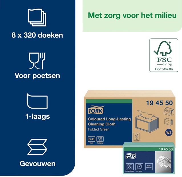 Tork Long Lasting gevouwen reinigingsdoek W8 is multifunctioneel en geschikt voor allerlei schoonmaakwerkzaamheden waarbij sterkte en absorptie nodig is.