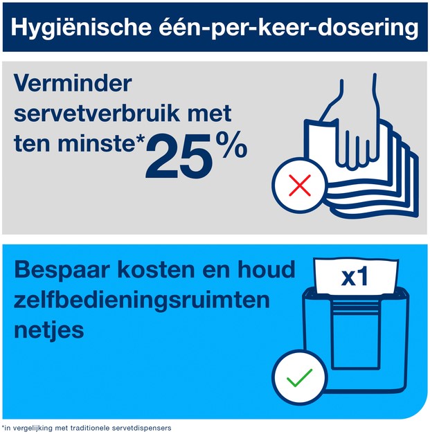 Dankzij de gebruiksvriendelijke één-per-keer-dosering wordt er minstens 25% minder servetten verbruikt vergeleken met traditionele servetdispensers.