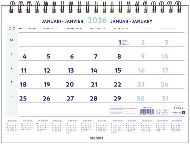1-Maandskalender 2026 Brepols 43x31.5cm 1 Stuk