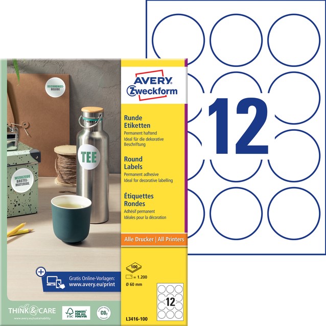 De zelfklevende etiketten met een diameter van 60 mm zijn eenvoudig te bedrukken met behulp van de Avery online software en templates.