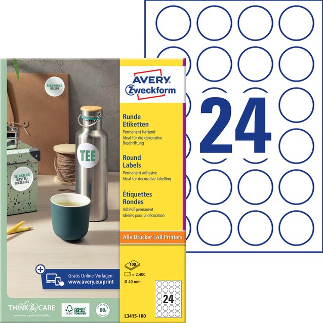 Etiket Avery L3415 rond 40mm wit 2400st 100 Vel