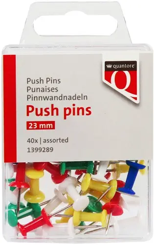 De push pins van Quantore zijn perfect voor het snel en eenvoudig bevestigen van notities, memo’s, foto's of kaarten op prikborden of zachte wanden. Deze punaises worden geleverd in een blisterverpakking met 40 stuks in vrolijke assorti kleuren, waardoor je eenvoudig kunt ordenen of markeren. Ze zijn voorzien van een stevige kunststof kop en een scherpe metalen punt voor gemakkelijk gebruik. Ideaal voor op kantoor, op school of thuis.Kenmerken: