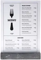 Kaarthouder met een luxe zware antraciet polystone voet voor een glasheldere presentatie van o.a. menukaarten.