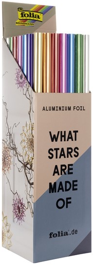 Deze display bevat 50 rollen folie in verschillende kleuren.