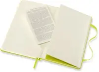 Kenmerken: afgeronde hoeken, elastische sluiting, ivoorkleurig Moleskine-papier, bijpassend leeslint, papier: 70 gsm, zuurvrij, “In geval van verlies”-label op het schutblad, uitbreidbaar binnenvak op achterkaft.