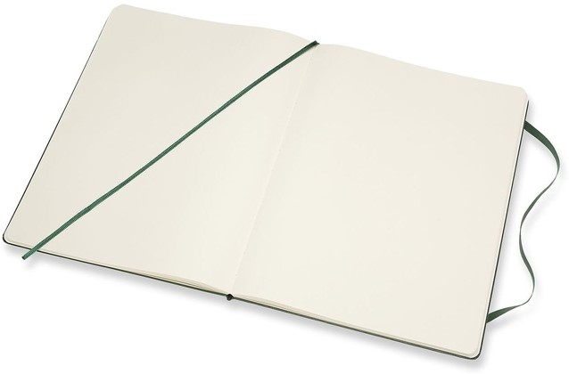 Kenmerken: afgeronde hoeken, elastische sluiting, ivoorkleurig Moleskine-papier, bijpassend leeslint, papier: 70 gsm, zuurvrij, “In geval van verlies”-label op het schutblad, uitbreidbaar binnenvak op achterkaft.