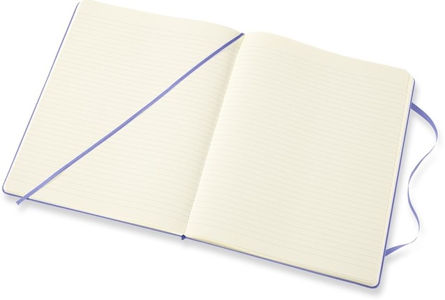 Kenmerken: afgeronde hoeken, elastische sluiting, ivoorkleurig Moleskine-papier, bijpassend leeslint, papier: 70 gsm, zuurvrij, “In geval van verlies”-label op het schutblad, uitbreidbaar binnenvak op achterkaft.