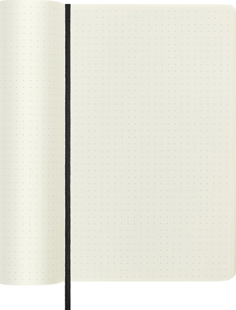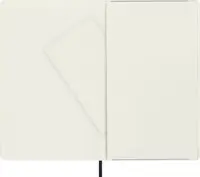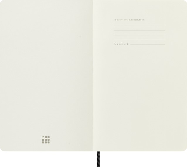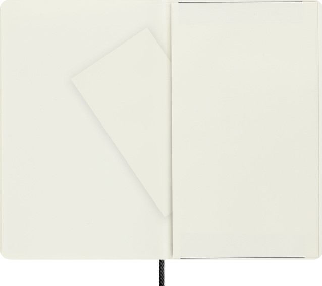 Kenmerken: afgeronde hoeken, elastische sluiting, ivoorkleurig Moleskine-papier, bijpassend leeslint, papier: 70 gsm, zuurvrij, “In geval van verlies”-label op het schutblad, uitbreidbaar binnenvak op achterkaft.