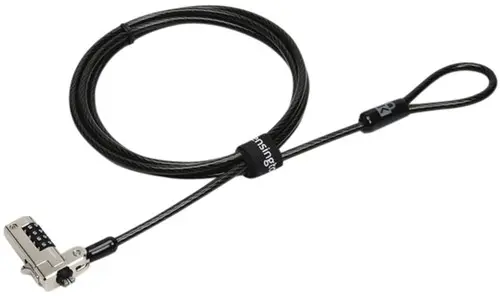 Koolstofstalen kabel is bestand tegen doorsnijden. Een plastic omhulsel beschermt de verankeringspunten op bureaus, tafels en andere vaste objecten.