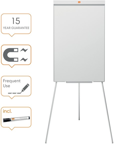 De stalen flipover met driepootstatief heeft een modern, onopvallend en smal frame waardoor de ruimte van het bord wordt gemaximaliseerd, met de ruime pennengoot geplaatst onder het bord zonder de schrijfruimte te blokkeren. Het driepootstatief kan in hoogte worden aangepast of worden ingetrokken om het bord op te bergen of te verplaatsen. Magnetisch whiteboardoppervlak met stalen oppervlakte biedt een verhoogde uitwisbaarheid.