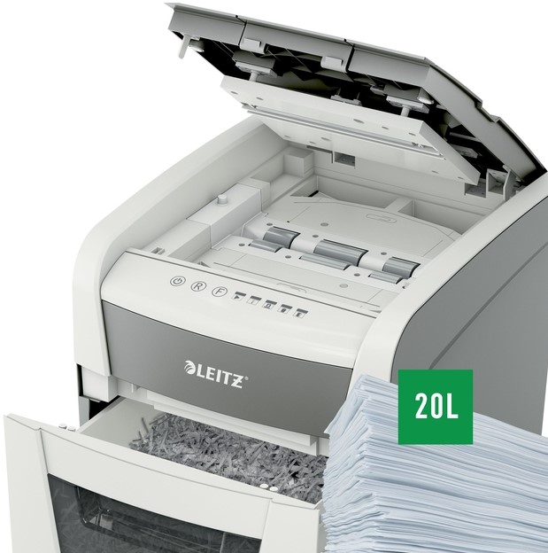 Volautomatische papiervernietiger van Leitz. Zo intelligent dat hij zelfstandig werkt, voer je stapel papier (incl. nietjes & paperclips) in, sluit het deksel en ga verder met waarmee je bezig was. Ideaal voor klein kantoor of kantoor aan huis. Hogere beveiliging en uitstekende prestaties met de anti-vastlooptechnologie, stille en 10 minuten doorlopende werkduur auto feed papiervernietiger. Vernietigt automatisch 50 vellen A4 in P4 cross cut snippers (4x28mm) tegelijkertijd in de ruime 20L opvangbak. Eenvoudige bediening door middel van tiptoetspaneel.