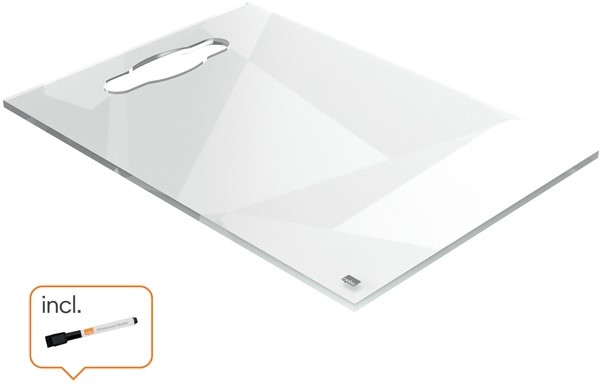 Het heldere acryl notitiebord ligt vlak om gemakkelijk te kunnen beschrijven en is ideaal als draagbaar whiteboard door de geïntegreerde handgreep.
