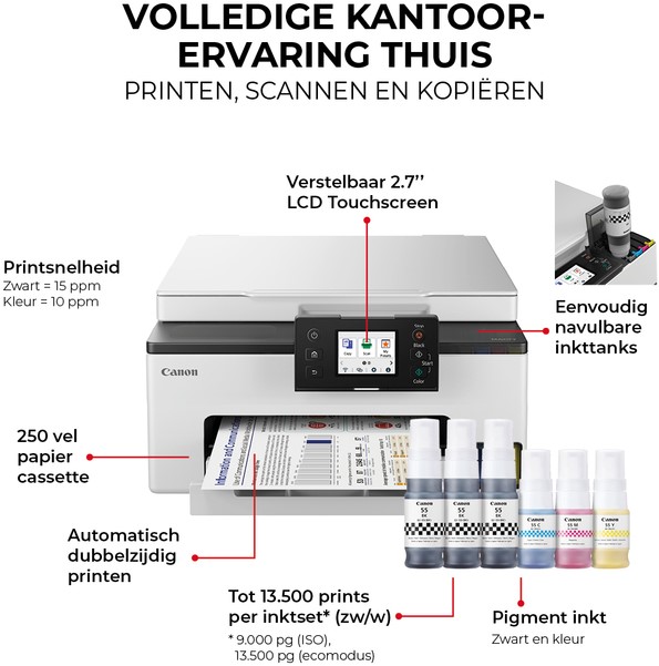 Wat zit er in de doos?: Canon MAXIFY GX1050 printer. Inktset inclusief extra zwarte inktflessen. Netsnoer, handleiding en installatiegids Garantie: Standaard: 2 jaar. Uitgebreid: 3 jaar na registratie via canon.nl/officepromotio.