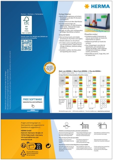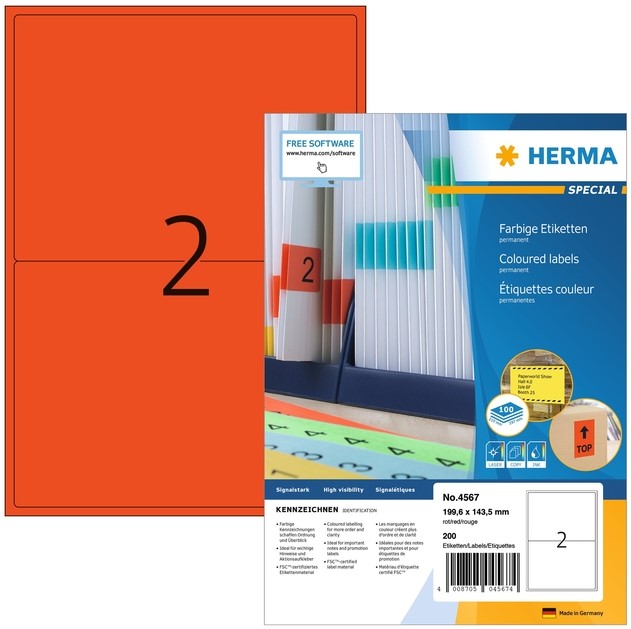Gekleurde etiketten op A4-vellen, zelfklevend, etiketformaat 199,6x143,5mm rood permanent hechtend, 100 vel per verpakking. Ideaal voor het labelen met signaalfunctie, bijv. waarschuwingsstickers, spoedaantekeningen, adreswijzigingen, kleurcodering, acties. Milieuvriendelijk: FSC® Mix Credit-gecertificeerd, chloorvrij gebleekt, oplosmiddelvrije contactlijm. Etiketten zijn 100 % recyclebaar via het oud papier, verpakking van gerecycled karton. Zeer goede drukresultaten op alle laser- en inkjetprinters, kopieerapparaten, kleurenlaserprinters en kleurenkopieerapparaten. Storingvrije verwerking dankzij veiligheidsrand rondom en optimale vlakligging. Gratis softwareoplossingen: www.herma.com/software.