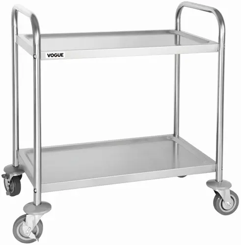 Serveerwagen van het toonaangevende merk Vogue. Van uitstekende kwaliteit en gemaakt van sterk en duurzaam RVS. Compleet met 4 wielen, waarvan 2 geremd voor het veilig en eenvoudig transporteren van items. Deze serveerwagen met 2 bladen helpt uw personeel bij het afruimen van tafels, ruimtes schoon en hygiënisch te houden en klanten tevreden te houden.