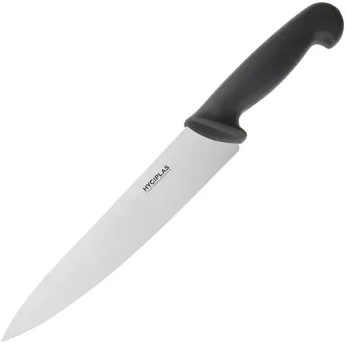 Goede kwaliteit messen van Hygiplas. Vaatwasserbestendig en eenvoudig te slijpen, met zwart nylon heft voor een comfortabele grip. Dit koksmes is ideaal voor algemeen gebruik, zoals het hakken, fijnhakken en snijden van vlees en groenten.