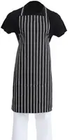 Schorten houden personeel schoon tijdens het werk en verminderen het risico op beschadiging van de kleding door vlekken of spatten. Dit slagersschort van whites is uitgevoerd in zwart met witte strepen, dat vlekken minder zichtbaar maakt en een opgeruimde indruk maakt. De extra lange taillebanden maken het schort geschikt voor alle maten.