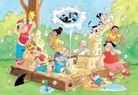 Het is een mooie dag en de Jan van Haasteren vriendjes leven zich uit in de zandbak. Van zandkoekjes tot grandioze zandkastelen, de mooiste creaties komen uit het zand tevoorschijn! De huisdieren Kat en hond Max komen ook een kijkje nemen, maar vooral Max is te enthousiast over de zandpret. Plots schept Jan te diep in de zanbak en springt er een leiding, of is het de tuinslag die per ongeluk in de zanbak is ingegraven? Kat is hier in ieder geval alles behalve blij mee! Jan van Haasteren Junior laat kinderen vanaf 6 jaar kennismaken met de absurde wereld van deze beroemde puzzels. Ze zetten hun eerste stappen in de humoristische illustraties van Jan van Haasteren en maken vorderingen met verschillende aantallen en moeilijkheidsgraden. Perfecte activiteit: puzzelen is de ideale activiteit voor schermvrije tijd, het stimuleert de concentratie en is ontspannend. Milieuvriendelijk: alle Jan van Haasteren puzzels zijn gemaakt van 100% gerecycled karton en duurzaam geproduceerd papier.