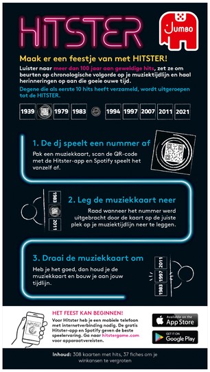 Met meer dan 300 van de grootste hits van de afgelopen 100 jaar is Hitster het perfecte partyspel voor een avond lachen, zingen dansen en het delen van herinneringen. Maak de doos open, scan een muziekkaart en laat de muziek de rest doen om er een feestje van te maken! Dus waar wacht je nog op? Nodig je vrienden uit voor een avondje plezier en ontdek wie uitgeroepen wordt tot Hitster! Hitster is het partyspel waarbij je geen muziekexpert hoeft te zijn. Je kans om te winnen wordt wel groter als je ook de artiesten en titels van het nummer kunt noemen. Kenmerken; - Partyspel voor volwassenen vanaf 16 jaar, voor 2 tot 10 spelers - De gemakkelijke spelregels maken dat je het spel snel kunt opstarten, scan de muziekkaart en laat de muziek de rest doen! - Hitster heeft een competitieve, coöperatieve en solo speeloptie, zo kun je in elk gezelschap een feestje creëren! - Dit gezelschapsspel bevat 308 muziekkaarten met hits en 37 fiches om jouw winkansen te vergroten.