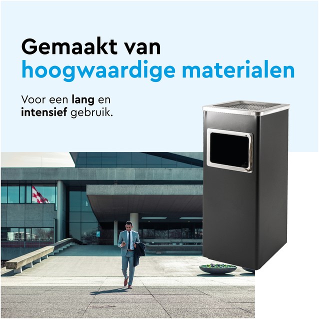 Met zijn elegante vierkante ontwerp en praktische functies is deze zwarte prullenbak met asbak een must-have voor elke (openbare)ruimte, zowel binnen als buiten. Bestel vandaag nog en geniet van een gebruiksvriendelijke en stijlvolle oplossing voor al je afval- en sigarettenrestbeheer.