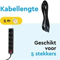 Met zijn handige aan-uit schakelaar kun je gemakkelijk de toevoer van elektriciteit regelen, waardoor je zelf ook het energieverbruik in huis of kantoor bepaald. De schakelaar is uitgerust met verlichting, zodat je ook in het donker duidelijk kunt zien of de schakelaar is ingeschakeld of niet. De verdeeldoos heeft een kabellengte van 5 meter en een zwarte kunststof behuizing. Door de handige schuine plaatsing van de stopcontacten kunnen er makkelijker haakse stekkers op worden aangesloten.