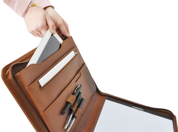 Deze Business Classy conferentiemap is handgemaakt van hoogwaardig kunstleer in Dutch Design.Bevat 8 opberg- en insteekvakken , waarin accessoires zoals pennen, visitekaartjes en documenten opgeborgen kunnen worden. Eén vak is geschikt voor een tablet, maar kan ook gebruikt worden als opbergvak voor A4 documenten. Business Classy conferentiemappen combineren praktisch gebruik met een luxe en minimalistisch Dutch Design. Voor een professionele en stijlvolle indruk bij elke gelegenheid. Met de verscheidenheid aan goed doordachte vakken neem je jouw documenten overzichtelijk geordend mee naar iedere afspraak. Door de rondom lopende ritssluiting kun je de schrijfmap volledig afsluiten. Zo kun je de schrijfmap overal mee naar toe nemen zonder het risico te lopen iets te verliezen.