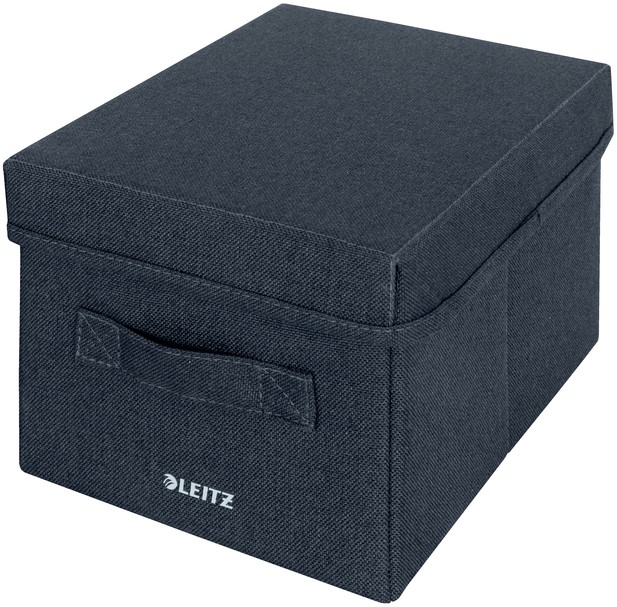 Met zijn minimalistische ontwerp en uitnodigende matgrijze fluwelen afwerking kan je georganiseerd blijven en tegelijkertijd stijl toevoegen aan je huis en werkruimtes. Leitz stoffen opbergdozen met deksel zijn ideaal voor het opbergen van kantooraccessoires zoals opladers en nietmachines om ze georganiseerd en gemakkelijk toegankelijk te houden. Thuis kunnen de opbergdozen worden gebruikt om foto's en andere kleinere voorwerpen in op te bergen. Gemaakt van zacht materiaal dat is versterkt met gerecycled karton voor stevigheid en duurzaamheid. Totaal 57% gerecycled materiaal. Wanneer ze niet gebruikt worden, zijn de opvouwbare opbergdozen volledig inklapbaar zodat ze gemakkelijk kunnen worden opgeborgen. Deze kleine opbergdozen met handgrepen zijn de perfecte toevoeging aan je huis of kantoor om ervoor te zorgen dat je de hele dag ontspannen en productief blijft.