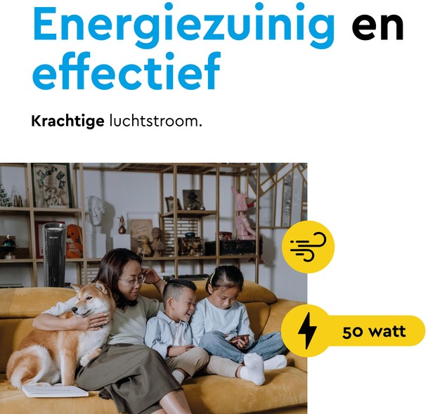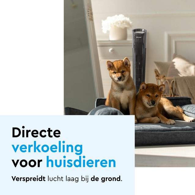 Ideaal voor huisdieren en gehele ruimteverkoeling. Doordat deze kolomventilator ook laag bij de grond lucht verspreidt, is hij perfect voor huisdieren die verkoeling zoeken op warme zomerdagen. De stabiele vierkante voet zorgt ervoor dat hij stevig op zijn plek blijft staan.