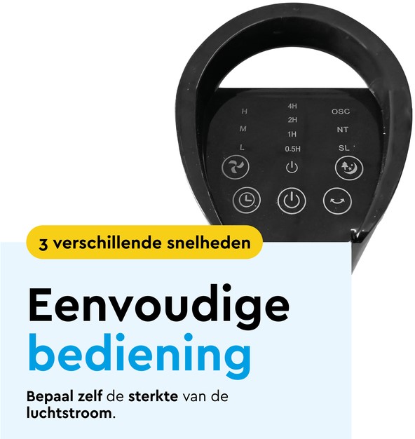 Moeiteloze bediening met afstandsbediening. Pas alle instellingen aan zonder op te staan! Met de afstandsbediening stel je moeiteloos de snelheid, de oscillatiefunctie en de timer in. Liever handmatig bedienen? De handige knoppen bovenop de ventilator maken de bediening eenvoudig en gebruiksvriendelijk.