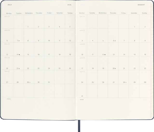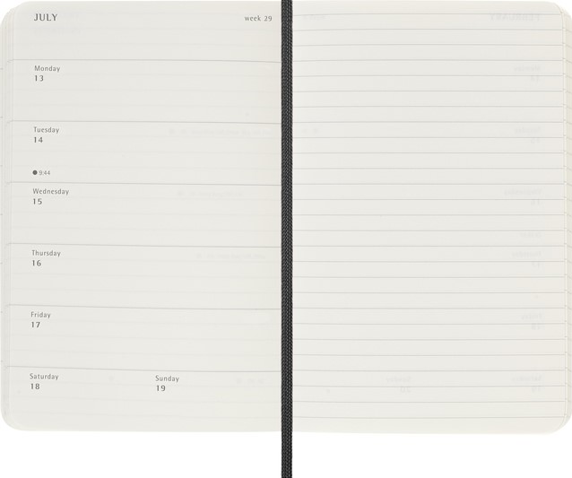 De Moleskine 18 Maanden Weekly Notebook Planner loopt van juli tot december. Deze populaire planner is ingedeeld om de afspraken van de week aan de linkerkant weer te geven en heeft een gelinieerde pagina voor notities en ideeën aan de rechterkant. Hierdoor is het notebook perfect voor studenten, docenten en professionals. De planner heeft een harde of zachte kaft met afgeronde hoeken en een elastische sluiting. - Harde kaft - Afgeronde hoeken - Elastische sluiting - Moleskine ivoorkleurig papier - Papiergewicht: 70 g/m² - Handige tools: planning, tijdzones, internationale metingen, toegangscodes en vluchtduur - Wereldwijde feestdagenkalender verkrijgbaar via moleskine.com/diaryaddons - Uitbreidbaar binnenvak passend bij de kleur van het notebook - "In geval van verlies" label gedrukt op het schutblad - Bijpassende bladwijzer voor lint - Herbruikbare paperband B-SIDE met extra gedrukte tools - 180° liggende opening - Moleskine srl. creëert en verkoopt FSC-gecertificeerde producten
